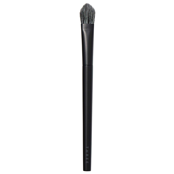 THREE Face Brush S R is a tapered brush designed for detailed work. Its shape fits perfectly around the eyes and nose, making it ideal for applying highlighter, contour, or setting powder in targeted areas.