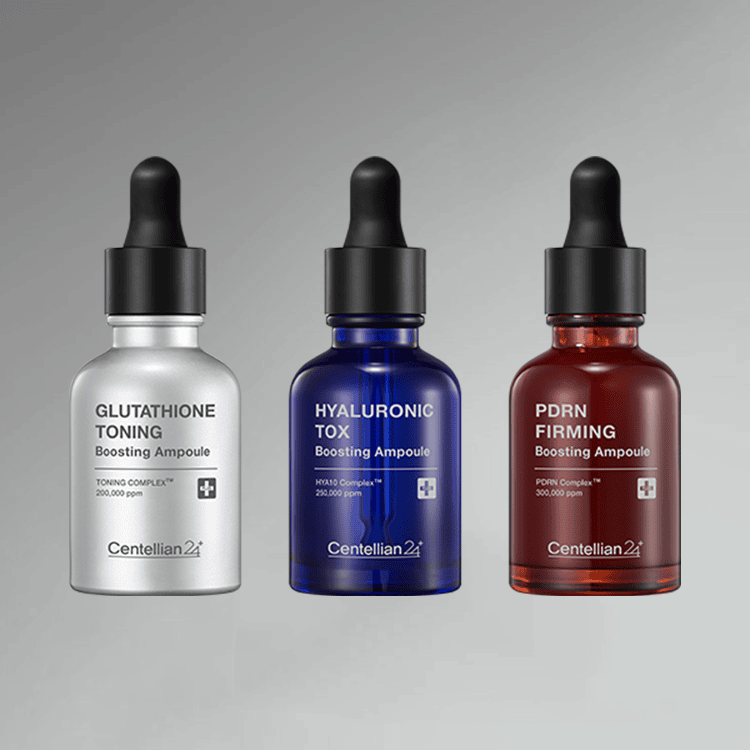 Boosting Ampoule 3 Types includes PDRN, Glutathione, and Hyaluronic Acid ampoules for varied skin needs.