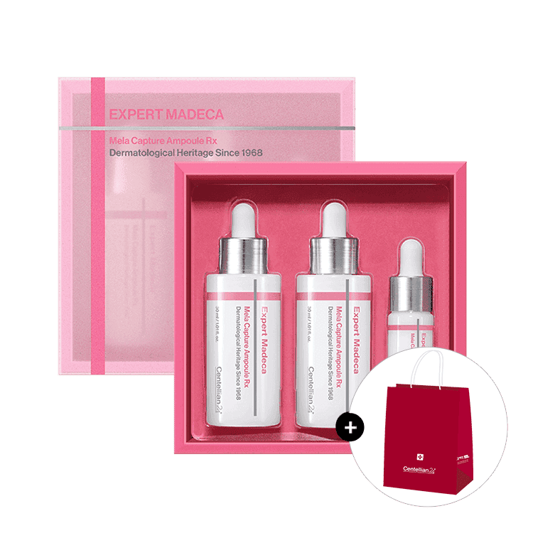 Expert Madeca Mela Capture Ampoule RX Special Set includes two 30ml bottles and a 7ml mini. Intensive care for dark spots.