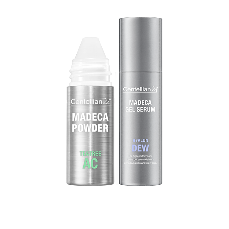 Madeca Powder Tea Tree AC + Madeca Gel Serum Hyaluronic Acid Dew is a duo designed to soothe troubled skin and provide lightweight hydration.